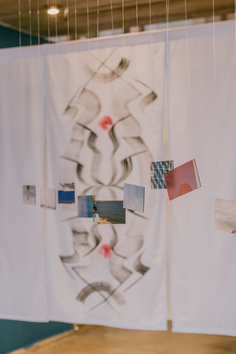 Duas linhas sinuosas, de tamanhos diferentes, são construídas pela suspensão de 80 detalhes de fotografias impressas em acrílico. Lado a lado, criando um espaço a ser percorrido pelos passantes, as linhas evocam dois rios – e a relação entre essas margens.