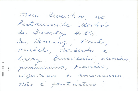 "Meu réveillon, no Restaurante Morton's de Beverly Hills. Eu, Henning, Paul, Michel, Norberto e Larry. Brasileiro, alemão, jamaicano, francês, argentino e americano. Não é fantástico?"